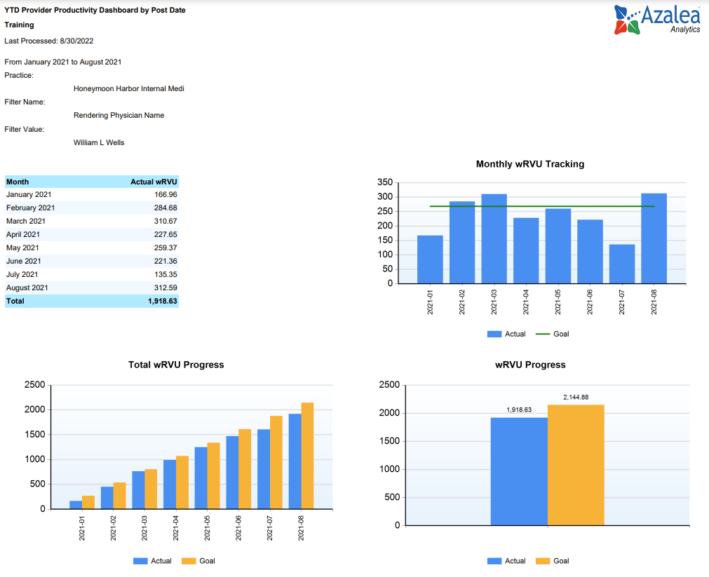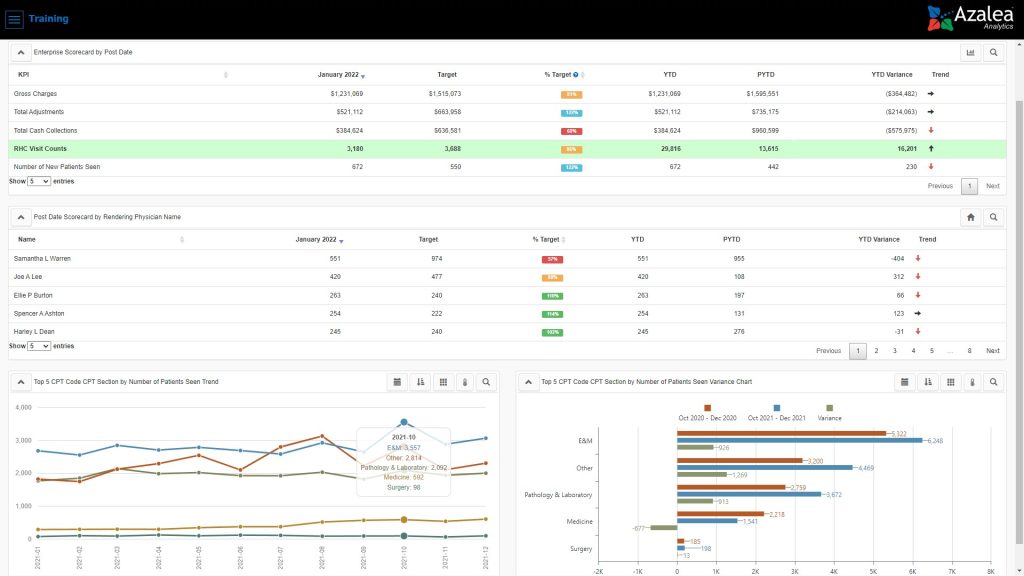 - Performance Management Dashboards and Reports: Azalea’s advanced reporting environment allows RHCs to set goals and benchmarks for every physician, location or even payer. Visually track over 100 key performance indicators including; Patient Volume and Productivity metrics such as RHC Qualifying Visit Count, New Patient Count, Unique Patients and RVUs. Match this with reporting on Financials, Collections, AR, and Denials KPIs for a full view of practice performance.