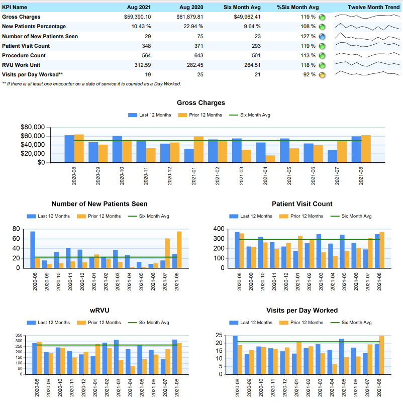 Understand and effectively communicate individual provider productivity by comparing KPIs such as gross charges, patient visit count, and procedures performed compared to monthly averages for a true view of performance over time.