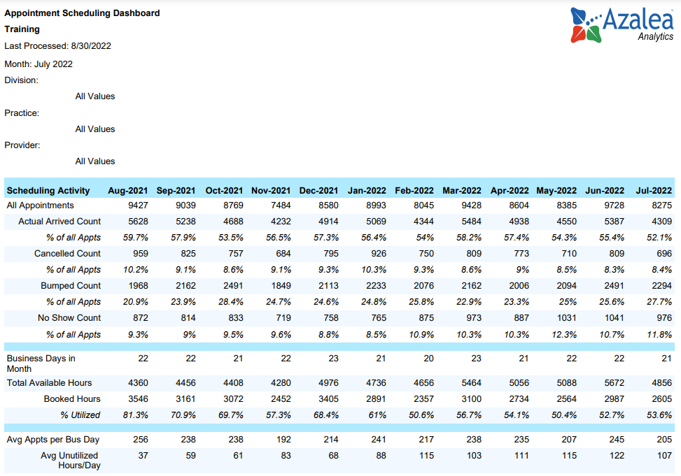 Break down and compare appointment arrivals, cancellations and no-shows to understand where efficiencies can be increased. Graphs showing fulfilled vs unfilled appointments highlight areas to be improved. The utilization analysis is especially helpful to manage resources and optimize scheduling.